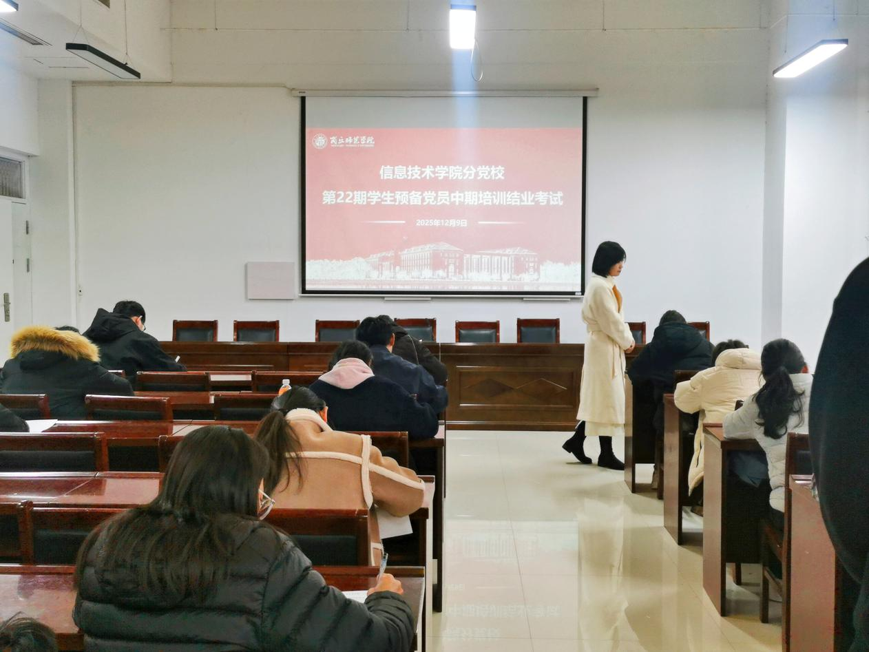 12月9日,软件学院分党校于三商楼112会议室组织了2025年下半年(第22期)学生预备党员培训结业考试,考试形式为闭卷考试,学生党支部书记李阳、杜冰监考。