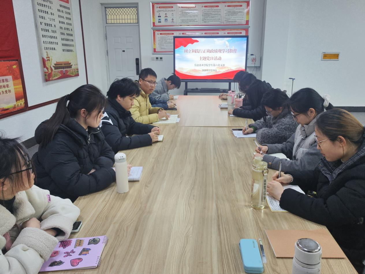 3月19日,软件学院学生第六党支部于三商楼114会议室开展树立和践行正确政绩观学习教育主题党日活动,会议由党支部书记杜冰主持,全体党员参加。