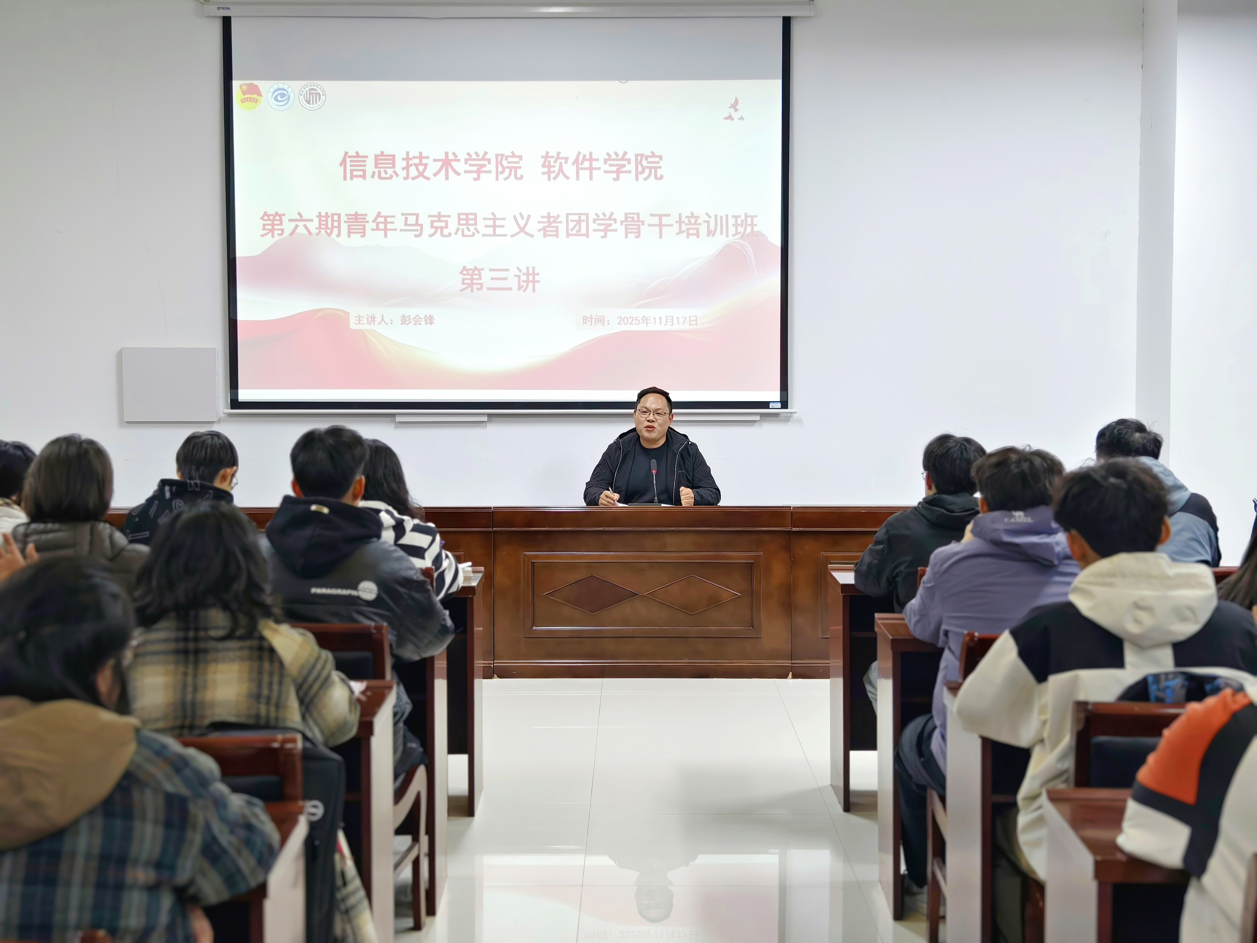 11月17日,软件学院第六期青年马克思主义者团学骨干培训班第三讲在梁园校区三商楼112会议室顺利开讲。本次培训以“明心立志,德才兼修”为主题,由学院团委副书记彭会锋担任主讲,培训班全体学员积极参训。