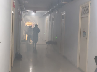 下午,演练正式启动。随着警报声响起,宿舍楼内迅速弥漫起模拟烟雾,全体住宿学生听到警报声后立即作出反应,用湿毛巾捂住口鼻,在现场楼层引导员指引下,弯腰低姿,沿着预定疏散路线,快速、有序地向34号楼南侧停车场撤离。整个过程中,工作人员分工明确、配合紧密,师生们行动迅速、秩序井然,充分体现了学院师生良好的应急素养和团队协作精神。