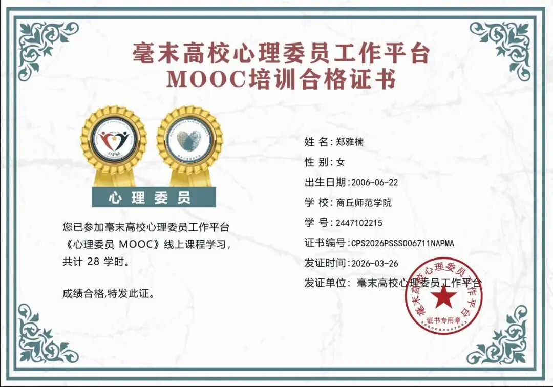 本次培训依托“高校心理委员工作平台”微信公众号开展,平台课程涵盖心理健康知识普及、心理危机识别与干预、朋辈沟通技巧、情绪疏导方法等核心内容,贴合高校心理委员工作实际需求。学院统筹安排培训进度,明确学习要求,督促全体心理委员利用课余时间完成线上课程学习、打卡测试与实操练习。参训心理委员态度端正、认真钻研,系统掌握了心理健康工作基础技能,清晰把握了心理委员的职责与工作方法,全部通过考核并获得由平台颁发的心理委员证书。